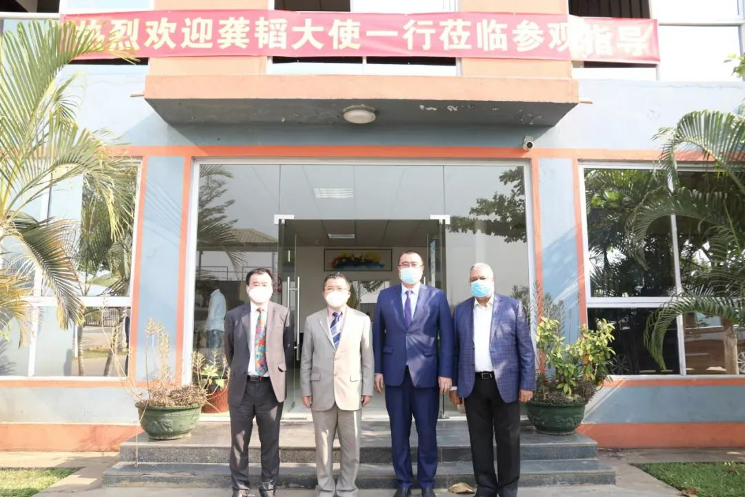 2022年7月8日,駐安哥拉大使龔韜參觀福盈安哥拉塑料制品有限公司(FULLBLISS ANGOLA COMPANY,LDA)位于北寬扎省的工廠,考察企業發展并同員工親切互動。